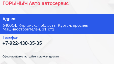 ГОРЫНЫЧ Авто, автосервис по адресу 640014, Курганская область, Курган, проспект Машиностроителей, 31 ст1 в дальнейшем Организация, размещена в следующих категориях: