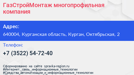 ГазСтройМонтаж, многопрофильная компания по адресу 640004, Курганская область, Курган, Октябрьская, 2 в дальнейшем Организация, размещена в следующих категориях: