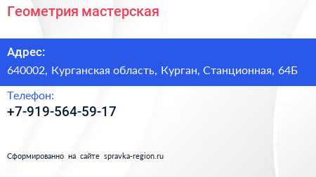 Геометрия, мастерская по адресу 640002, Курганская область, Курган, Станционная, 64Б в дальнейшем Организация, размещена в следующих категориях: