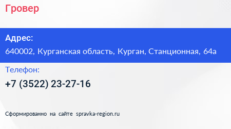 Гровер по адресу 640002, Курганская область, Курган, Станционная, 64а в дальнейшем Организация, размещена в следующих категориях: