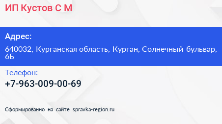 ИП Кустов С.М. по адресу 640032, Курганская область, Курган, Солнечный бульвар, 6Б в дальнейшем Организация, размещена в следующих категориях: