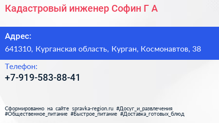 Кадастровый инженер Софин Г.А. по адресу 641310, Курганская область, Курган, Космонавтов, 38 в дальнейшем Организация, размещена в следующих категориях: