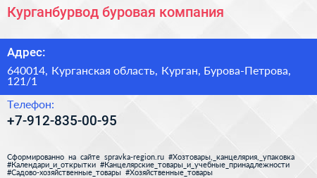 Курганбурвод, буровая компания по адресу 640014, Курганская область, Курган, Бурова-Петрова, 121/1 в дальнейшем Организация, размещена в следующих категориях: