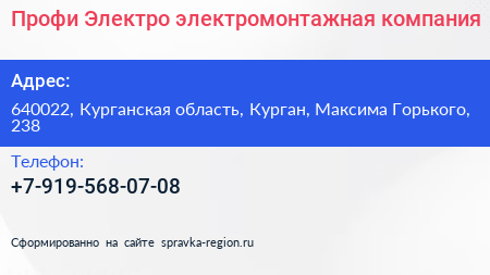Профи Электро, электромонтажная компания по адресу 640022, Курганская область, Курган, Максима Горького, 238 в дальнейшем Организация, размещена в следующих категориях: