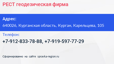 РЕСТ, геодезическая фирма по адресу 640026, Курганская область, Курган, Карельцева, 105 в дальнейшем Организация, размещена в следующих категориях: