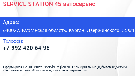 SERVICE STATION 45, автосервис по адресу 640027, Курганская область, Курган, Дзержинского, 35в/1 в дальнейшем Организация, размещена в следующих категориях: