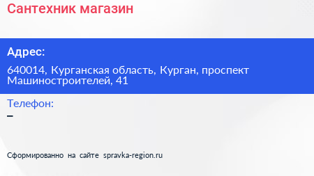 Сантехник, магазин по адресу 640014, Курганская область, Курган, проспект Машиностроителей, 41 в дальнейшем Организация, размещена в следующих категориях: