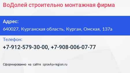 ВоДолей, строительно-монтажная фирма по адресу 640027, Курганская область, Курган, Омская, 137а в дальнейшем Организация, размещена в следующих категориях: