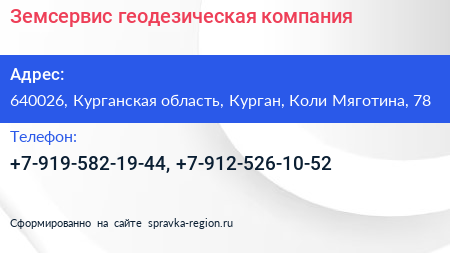 Земсервис, геодезическая компания по адресу 640026, Курганская область, Курган, Коли Мяготина, 78 в дальнейшем Организация, размещена в следующих категориях: