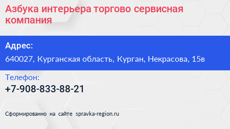 Азбука интерьера, торгово-сервисная компания по адресу 640027, Курганская область, Курган, Некрасова, 15в в дальнейшем Организация, размещена в следующих категориях: