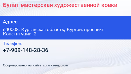 Булат, мастерская художественной ковки по адресу 640008, Курганская область, Курган, проспект Конституции, 2 в дальнейшем Организация, размещена в следующих категориях: