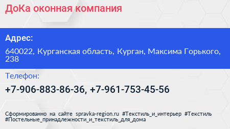 ДоКа, оконная компания по адресу 640022, Курганская область, Курган, Максима Горького, 238 в дальнейшем Организация, размещена в следующих категориях: