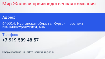 Мир Жалюзи, производственная компания по адресу 640014, Курганская область, Курган, проспект Машиностроителей, 40а в дальнейшем Организация, размещена в следующих категориях: