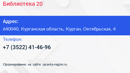 Библиотека №20 по адресу 640040, Курганская область, Курган, Октябрьская, 4 в дальнейшем Организация, размещена в следующих категориях:
