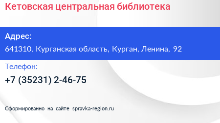 Кетовская центральная библиотека по адресу 641310, Курганская область, Курган, Ленина, 92 в дальнейшем Организация, размещена в следующих категориях: