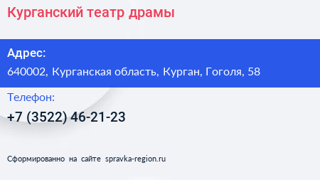 Курганский театр драмы по адресу 640002, Курганская область, Курган, Гоголя, 58 в дальнейшем Организация, размещена в следующих категориях: