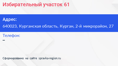 Избирательный участок №61 по адресу 640023, Курганская область, Курган, 2-й микрорайон, 27 в дальнейшем Организация, размещена в следующих категориях: