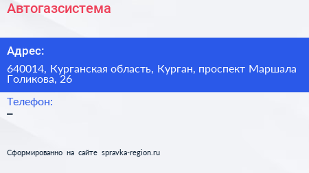 Автогазсистема по адресу 640014, Курганская область, Курган, проспект Маршала Голикова, 26 в дальнейшем Организация, размещена в следующих категориях: