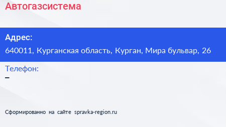 Автогазсистема по адресу 640011, Курганская область, Курган, Мира бульвар, 26 в дальнейшем Организация, размещена в следующих категориях: