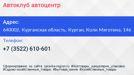 Автоклуб, автоцентр по адресу 640002, Курганская область, Курган, Коли Мяготина, 146 в дальнейшем Организация, размещена в следующих категориях: