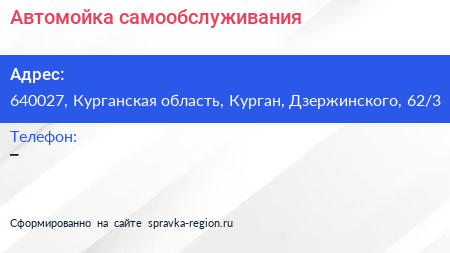 Автомойка самообслуживания по адресу 640027, Курганская область, Курган, Дзержинского, 62/3 в дальнейшем Организация, размещена в следующих категориях: