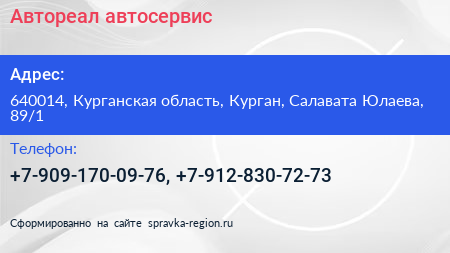 Автореал, автосервис по адресу 640014, Курганская область, Курган, Салавата Юлаева, 89/1 в дальнейшем Организация, размещена в следующих категориях:
