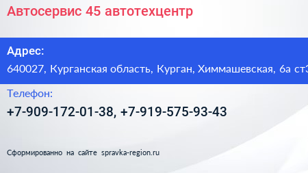Автосервис 45, автотехцентр по адресу 640027, Курганская область, Курган, Химмашевская, 6а ст3 в дальнейшем Организация, размещена в следующих категориях: