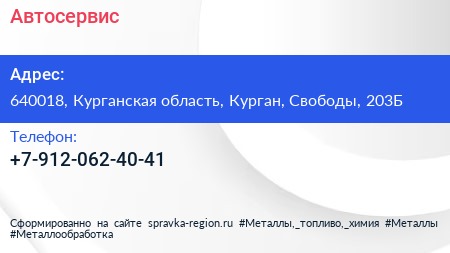 Автосервис по адресу 640018, Курганская область, Курган, Свободы, 203Б в дальнейшем Организация, размещена в следующих категориях: