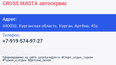 CROSS MASTA, автосервис по адресу 640032, Курганская область, Курган, Артёма, 45а в дальнейшем Организация, размещена в следующих категориях: