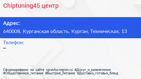 Chiptuning45, центр по адресу 640008, Курганская область, Курган, Техническая, 13 в дальнейшем Организация, размещена в следующих категориях: