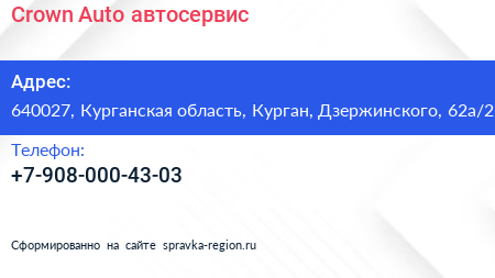 Crown Auto, автосервис по адресу 640027, Курганская область, Курган, Дзержинского, 62а/2 в дальнейшем Организация, размещена в следующих категориях: