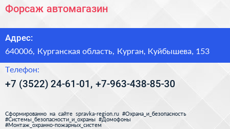 Форсаж, автомагазин по адресу 640006, Курганская область, Курган, Куйбышева, 153 в дальнейшем Организация, размещена в следующих категориях: