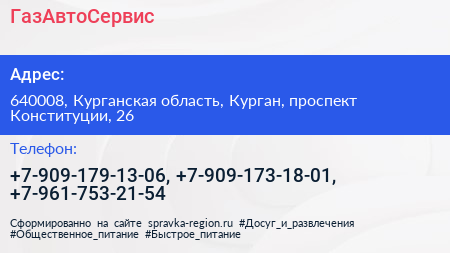 ГазАвтоСервис по адресу 640008, Курганская область, Курган, проспект Конституции, 26 в дальнейшем Организация, размещена в следующих категориях: