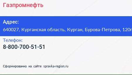 Газпромнефть по адресу 640027, Курганская область, Курган, Бурова-Петрова, 120г в дальнейшем Организация, размещена в следующих категориях: