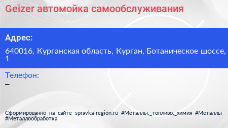 Geizer, автомойка самообслуживания по адресу 640016, Курганская область, Курган, Ботаническое шоссе, 1 в дальнейшем Организация, размещена в следующих категориях: