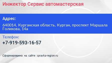 Инжектор Сервис, автомастерская по адресу 640014, Курганская область, Курган, проспект Маршала Голикова, 14а в дальнейшем Организация, размещена в следующих категориях: