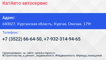 КатАвто, автосервис по адресу 640027, Курганская область, Курган, Омская, 179г в дальнейшем Организация, размещена в следующих категориях: