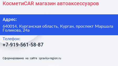 КосметиCAR, магазин автоаксессуаров по адресу 640014, Курганская область, Курган, проспект Маршала Голикова, 24а в дальнейшем Организация, размещена в следующих категориях: