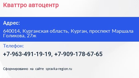 Кваттро, автоцентр по адресу 640014, Курганская область, Курган, проспект Маршала Голикова, 27ж в дальнейшем Организация, размещена в следующих категориях:
