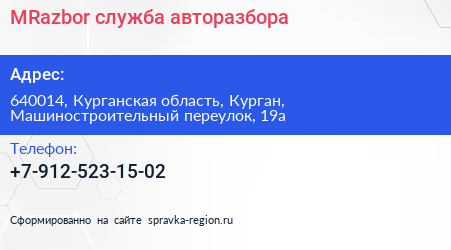 MRazbor, служба авторазбора по адресу 640014, Курганская область, Курган, Машиностроительный переулок, 19а в дальнейшем Организация, размещена в следующих категориях: