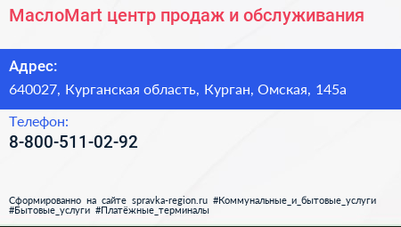 МаслоMart, центр продаж и обслуживания по адресу 640027, Курганская область, Курган, Омская, 145а в дальнейшем Организация, размещена в следующих категориях: