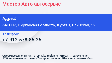 Мастер-Авто, автосервис по адресу 640007, Курганская область, Курган, Глинская, 12 в дальнейшем Организация, размещена в следующих категориях: