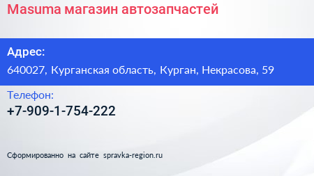 Masuma, магазин автозапчастей по адресу 640027, Курганская область, Курган, Некрасова, 59 в дальнейшем Организация, размещена в следующих категориях: