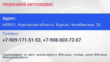 Нержавей, автосервис по адресу 640011, Курганская область, Курган, Челябинская, 1Б в дальнейшем Организация, размещена в следующих категориях: