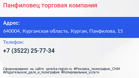 Панфиловец, торговая компания по адресу 640004, Курганская область, Курган, Панфилова, 15 в дальнейшем Организация, размещена в следующих категориях: