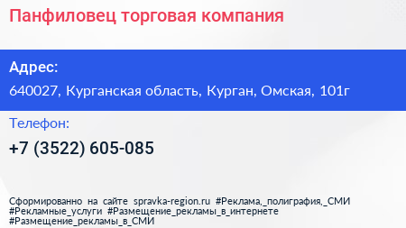 Панфиловец, торговая компания по адресу 640027, Курганская область, Курган, Омская, 101г в дальнейшем Организация, размещена в следующих категориях: