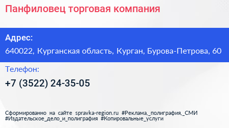 Панфиловец, торговая компания по адресу 640022, Курганская область, Курган, Бурова-Петрова, 60 в дальнейшем Организация, размещена в следующих категориях: