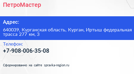 ПетроМастер по адресу 640039, Курганская область, Курган, Иртыш федеральная трасса 277 км, 3 в дальнейшем Организация, размещена в следующих категориях: