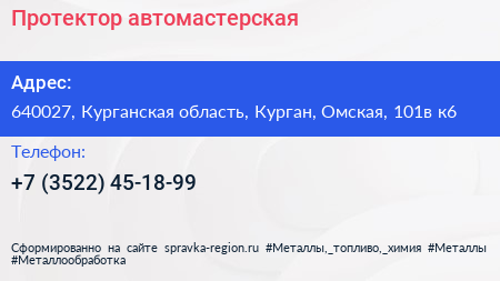 Протектор, автомастерская по адресу 640027, Курганская область, Курган, Омская, 101в к6 в дальнейшем Организация, размещена в следующих категориях: