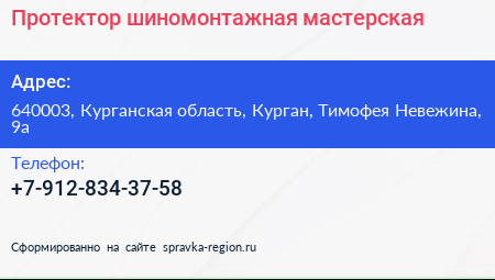 Протектор, шиномонтажная мастерская по адресу 640003, Курганская область, Курган, Тимофея Невежина, 9а в дальнейшем Организация, размещена в следующих категориях: